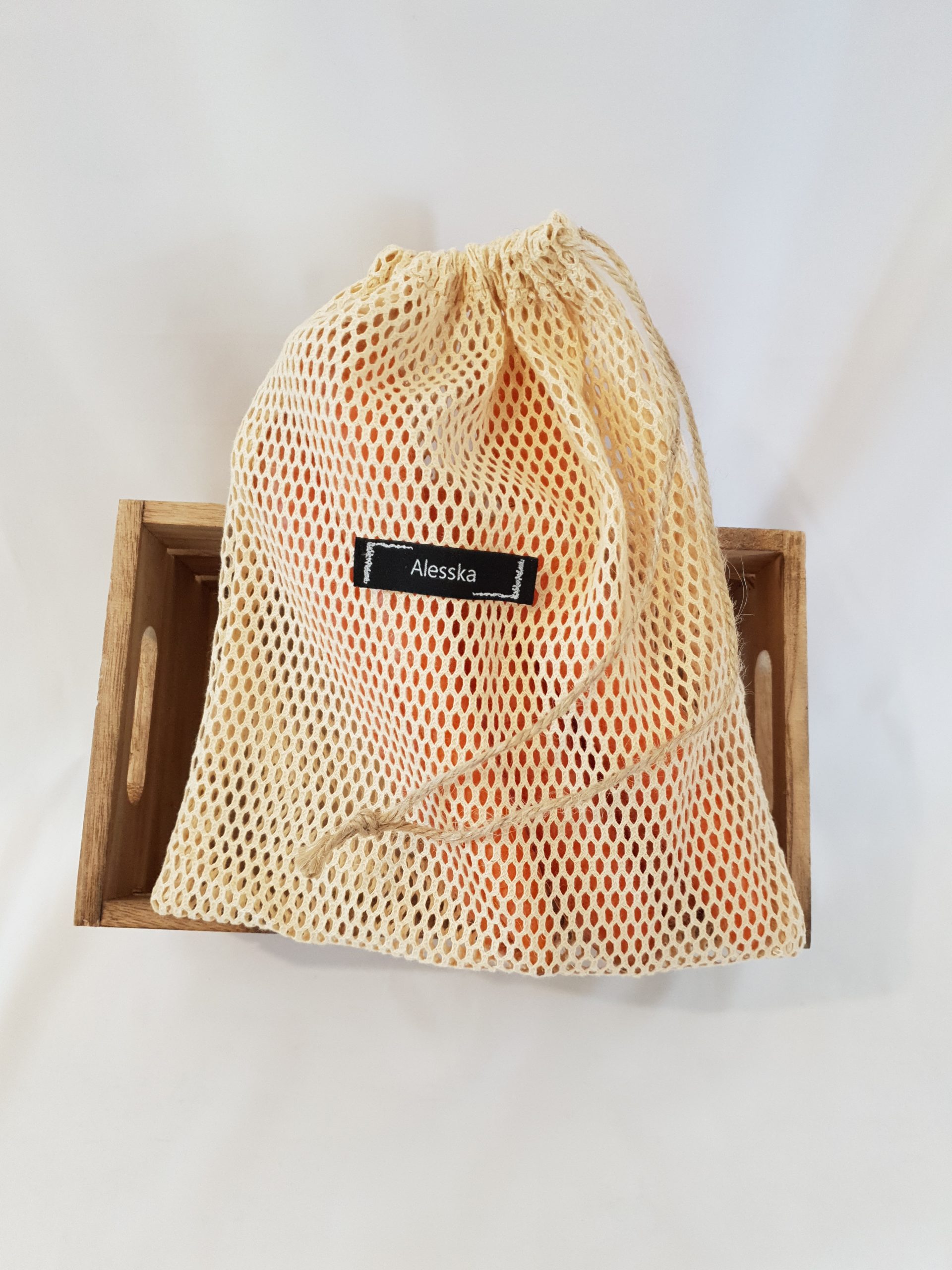 Composition : (L 28,5 cm X l 24 cm) 100 % coton Bio certifié Oeko-tex, ficelle en jute ou en coton pour la tirette.